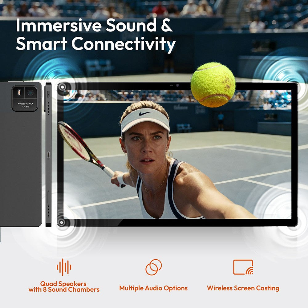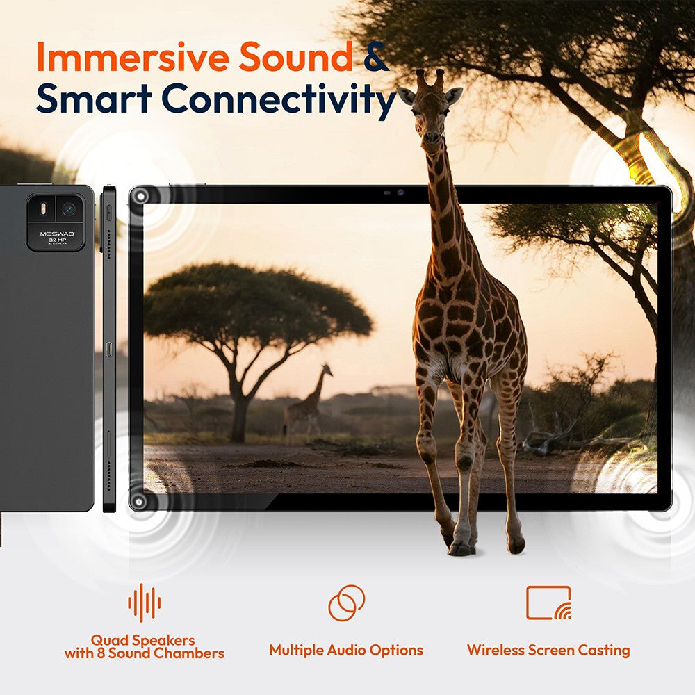 A 32MP rear camera captures detailed photos, while the 5MP front camera ensures crisp video calls. Four built-in speakers deliver immersive stereo sound for gaming, movies, and study.