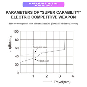 Tipo: lineare veloce Forza operativa: 45gf±10gf Precorsa: 1,08 mm±0,4 mm Escursione totale: 3,4 mm±0,4 mm Pin: interruttore a 3 pin Durata: 100 milioni di cicli |