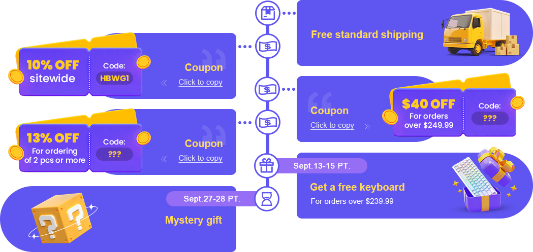 We have prepared an additional 10% discount and free shipping for each user. When you purchase two or more products, you will receive an additional 13% discount. When your order amount exceeds $249.99, you will get $40 discount, users who order more than $239.99 between September 13 and September 15, 2023 will get a free mystery keyboard gift box.