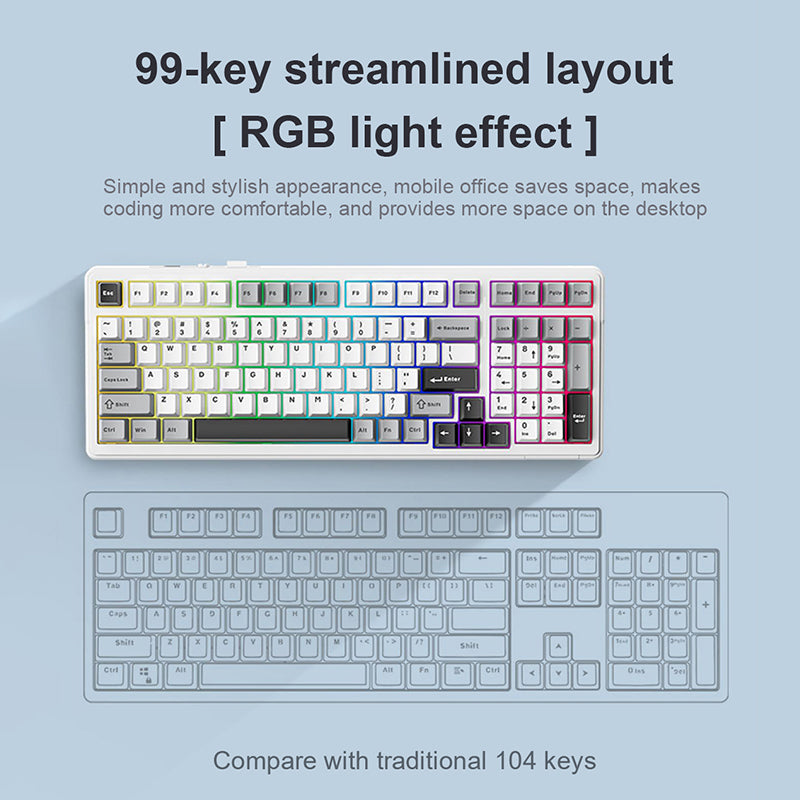 The AULA F99 utilizes a 96% layout, keeping the majority of keys found in a standard 108-key keyboard but in a smaller, more efficient design that frees up desk space. An ideal option for both mechanical keyboard beginners and those who frequently use the Numpad and function keys.