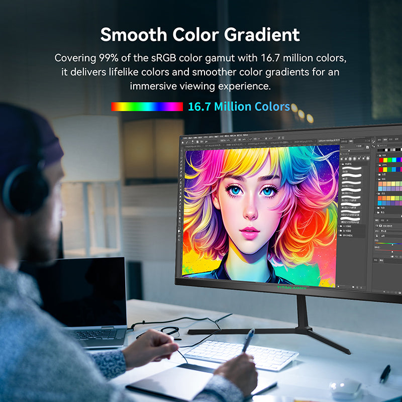 Witness the ultimate gaming experience on a TITAN ARMY P24H2P monitor! Its IPS panel provides a faster response rate, broader angle of view, amplified color and contrast, and vivid color accuracy and evenness- producing supremely crisp and lifelike visuals. Enjoy smooth and uninterrupted action with a 100Hz refresh rate, giving you smooth, precise mouse movements for even the most lightning-quick gaming sessions.
